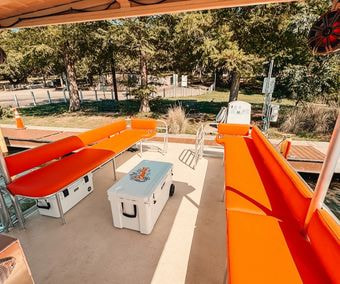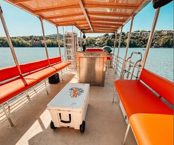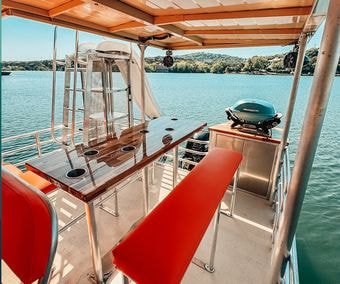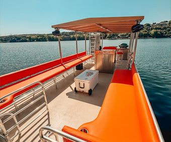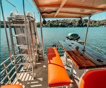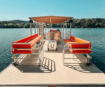 Looking for the perfect way to enjoy Lake Austin with friends and family? Our 29' Tiki pontoon boat is available for daily charter and offers everything you need for an unforgettable day on the water. With spacious and comfortable seating for up to 24 guests, including bar seating, there’s plenty of room for everyone to relax and enjoy the ride.
